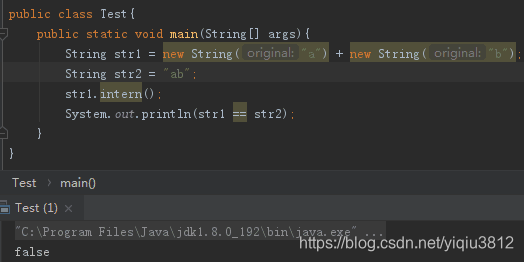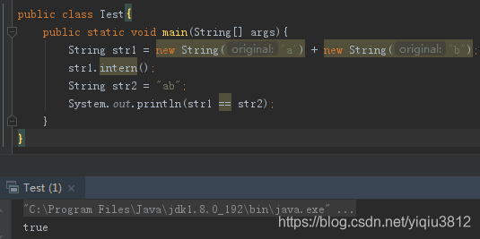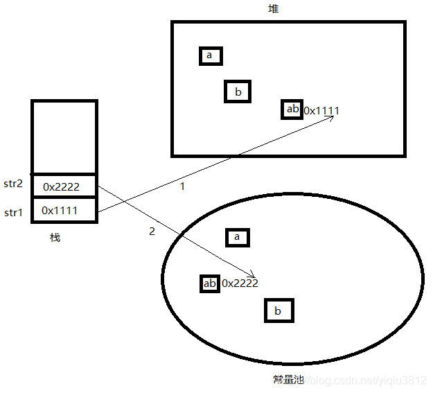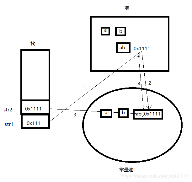 第一行代码:先分别在常量池和堆中存a b这两个值,str1指向堆中的ab