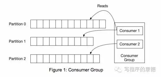 上图中有两个消费者,Consumer1有两个offset分别对应Partition0、Partition1(假设每一个Topic一个Partition);Consumer2有一个offset对应Partition2。这个offset是由客户端SDK负责保存的,Kafka的Broker完全无视这个东西的存在;一般情况下SDK会把它保存到zookeeper里面。(所以需要给Consumer提供zookeeper的地址)。