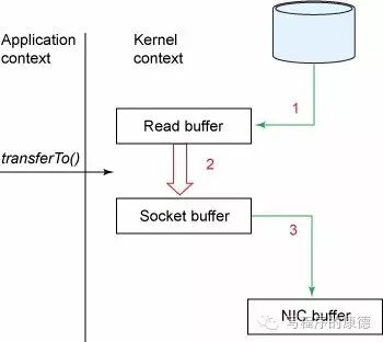 Zero Copy中直接从内核空间(DMA的)到内核空间(Socket的),然后发送网卡。