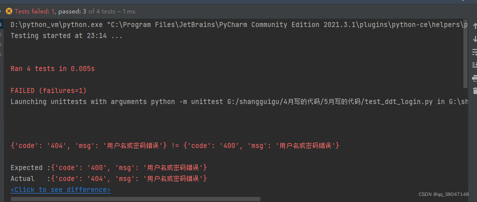 return {'code': '400', 'msg': '用户名或密码错误'}2.写一个unittest测试类 。测试类前面使用@ddt.ddt; 测试数据前使用 @ddt.data