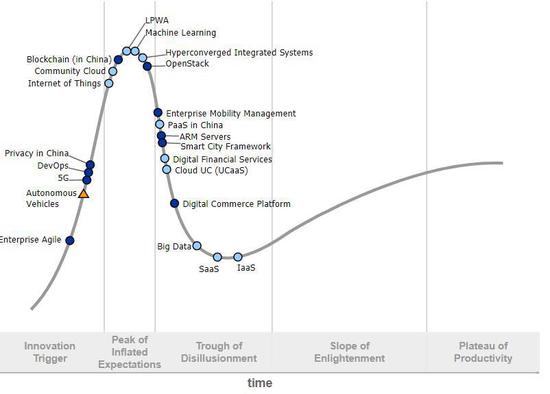 每年Gartner发布的技术成熟度曲线(The Hype Cycle)都备受市场关注,也成为企业做出重大投资决策的风向标。技术成熟度曲线又称技术循环曲线,光环曲线,炒作周期,指的是企业用来评估新科技的可见度,利用时间轴与市面上的可见度(媒体曝光度)决定要不要采用新科技的一种工具。