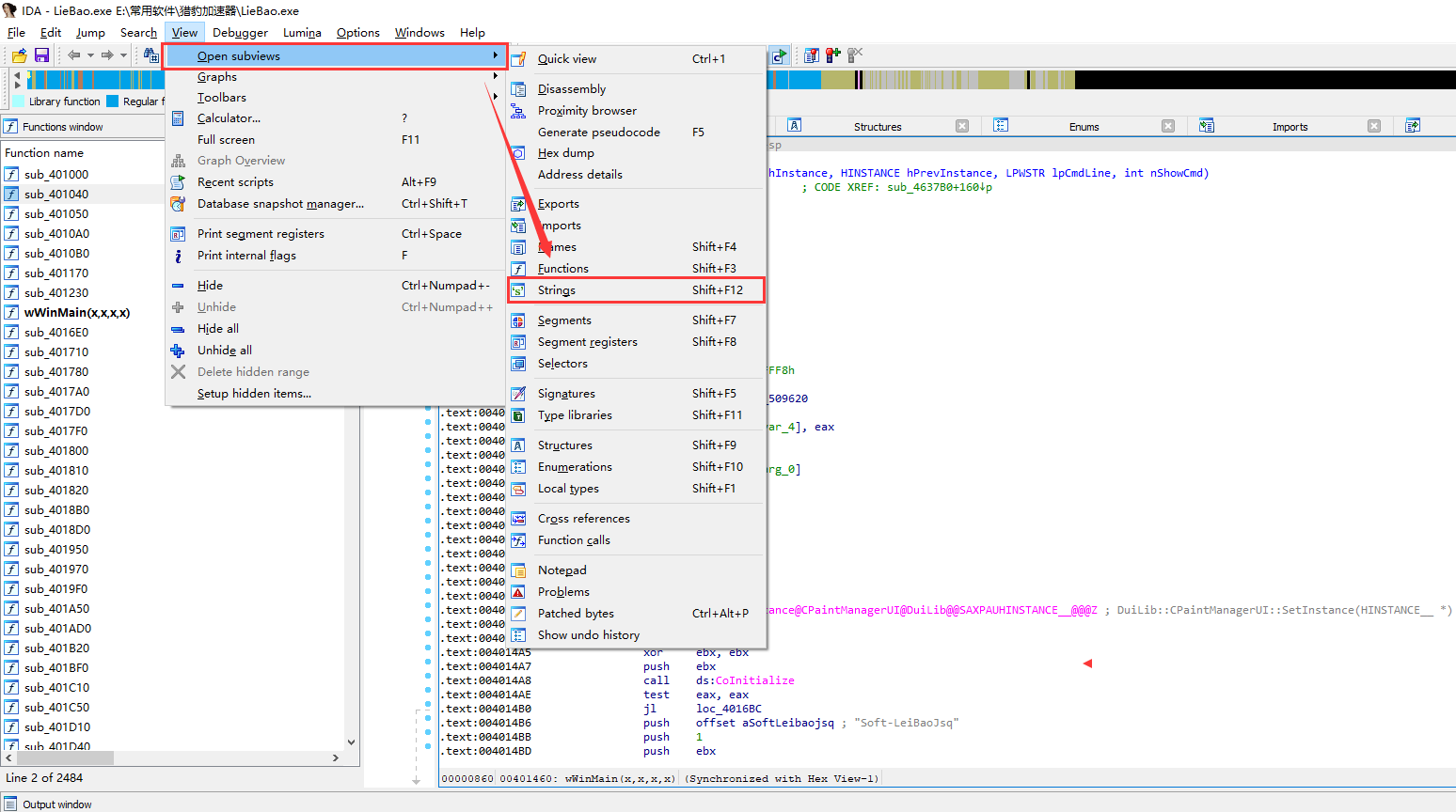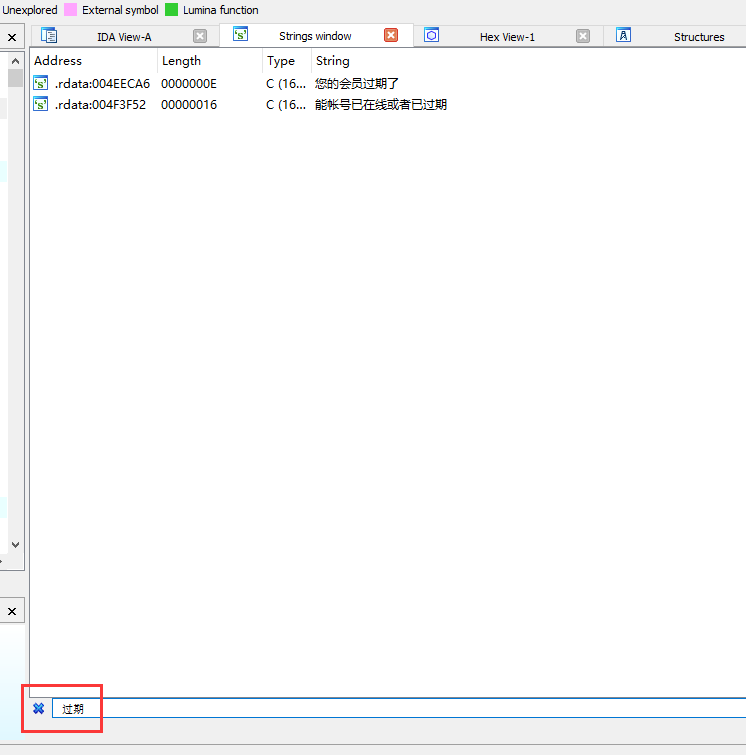 (注意的是:不是所有的字符串都能搜索,遇到字符串加密或者非硬编码字符串就无法搜索到)