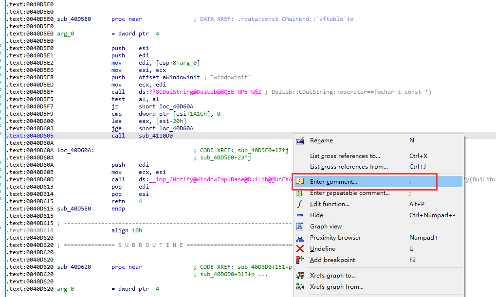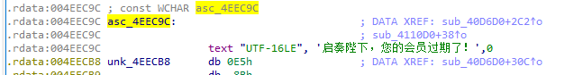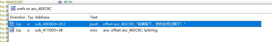 右键字符串 asc_4EEC9C ,选择 Jump to xref to operand…(快捷键是X) ,就能看到引用该字符串的代码