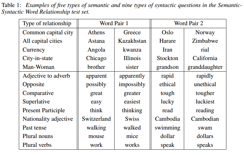 为了测量词向量的质量,我们定义了一个包含五类语义问题和九类句法问题的综合测试集。表1显示了每个类别中的两个示例。总共有8869个语义问题和10675个句法问题。每个类别中的问题都是通过两个步骤创建的:首先,手动创建类似的单词对列表。然后,通过连接两个单词对形成一个大的问题列表。例如,我们列出了68个美国大城市及其所属的州,通过随机抽取两对单词组成了大约2.5K个问题。我们在测试集中只包含单个token words,因此不存在多词实体(如New York)。