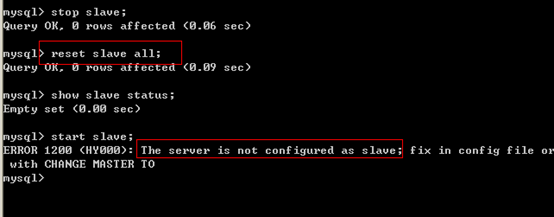 change master to master_host=”主服务器的ip地址”,master_user=”授权的用户名称”,master_password=”授权用户的密码”,master_log_file=”最新的 log-bin日志文件名称”,master_log_pos=”log-bin日志文件里面最后一个pos位置”