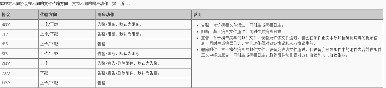NGFW支持对使用以下协议传输的文件进行病毒检测: