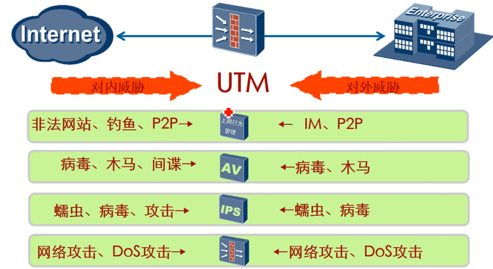统一威胁管理(Unified Threat Management),将防病毒、入侵检测和防火墙安全设备划归统一威胁管理(Unified Threat Management,简称UTM)新类别. 目前,UTM常定义为由硬件、软件和网络技术组成的具有专门用途的设备,它主要提供一项或多项安全功能,同时将多种安全特性集成于一个硬件设备里,形成标准的统一威胁管理平台。UTM设备应该具备的基本功能包括网络防火墙、网络入侵检测/防御和网关防病毒功能。