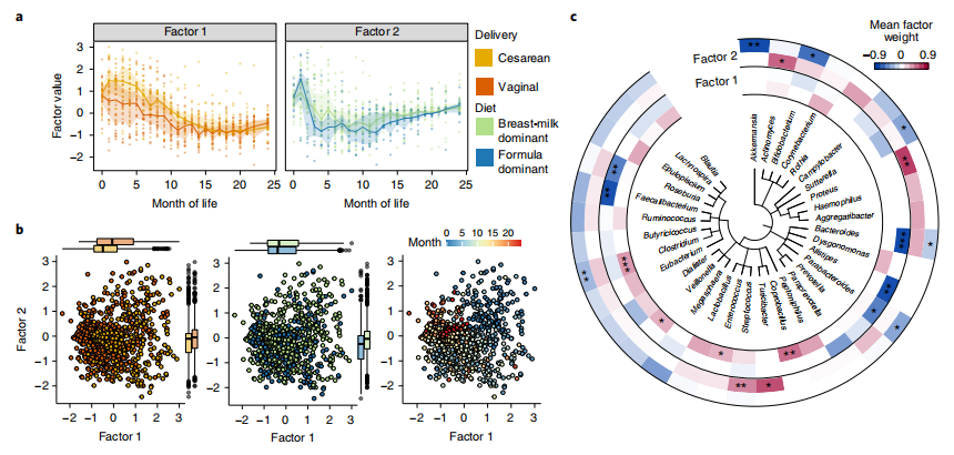 在稀疏纵向微生物组数据中的应用:作为第二个用例,开发团队将MEFISTO应用于婴儿出生后微生物组的纵向样本。MEFISTO根据出生模式(因子1)和婴儿饮食(因子2)确定了不同的时间轨迹。与不考虑时间协变量的方法不同,MEFISTO在掩盖随机选择的样本子集时,产生了因子值的稳健估计。
