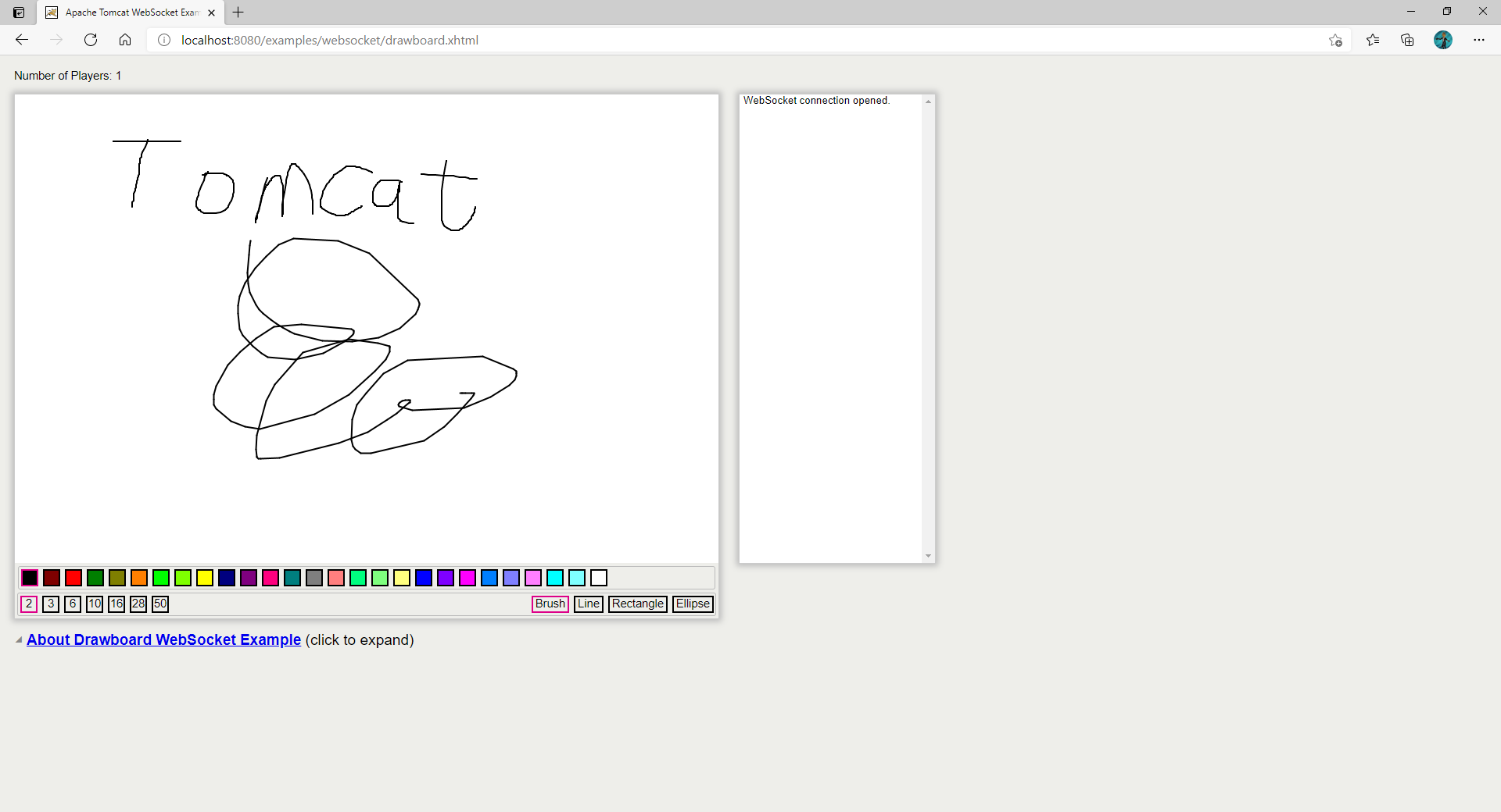 这是个人比较喜欢的一个基于tomcat的绘画的web应用 http://localhost:8080/examples/websocket/drawboard.xhtml(注意这个没有橡皮擦不过java2d支持的还是比较到位的)