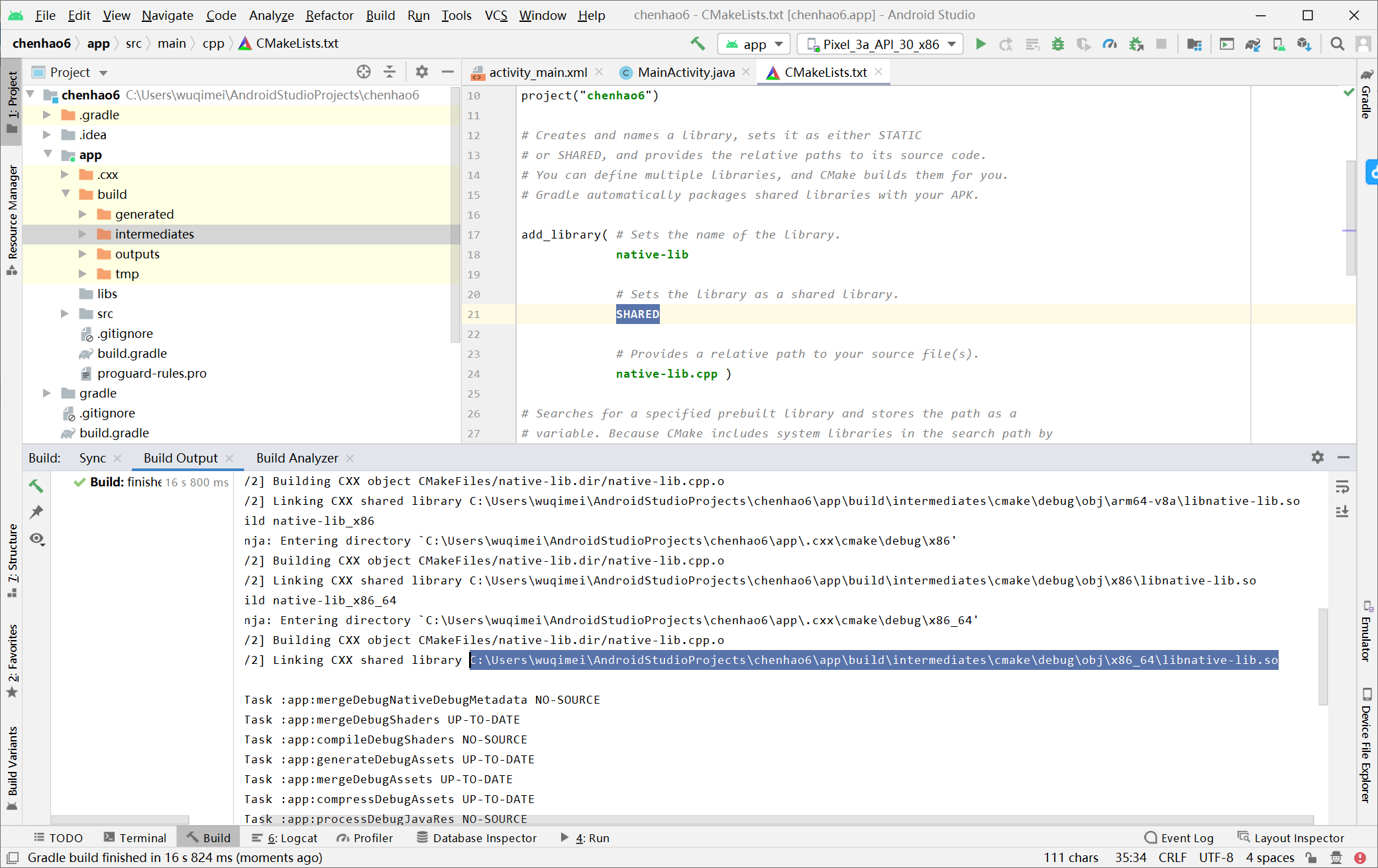 #endif //MY_APPLICATION_CALC_H打开CMakeLists.txt文件,将add_library下的SAHRED改为STATIC,将native-lib.cpp删掉 ,加上自己的calc.cpp