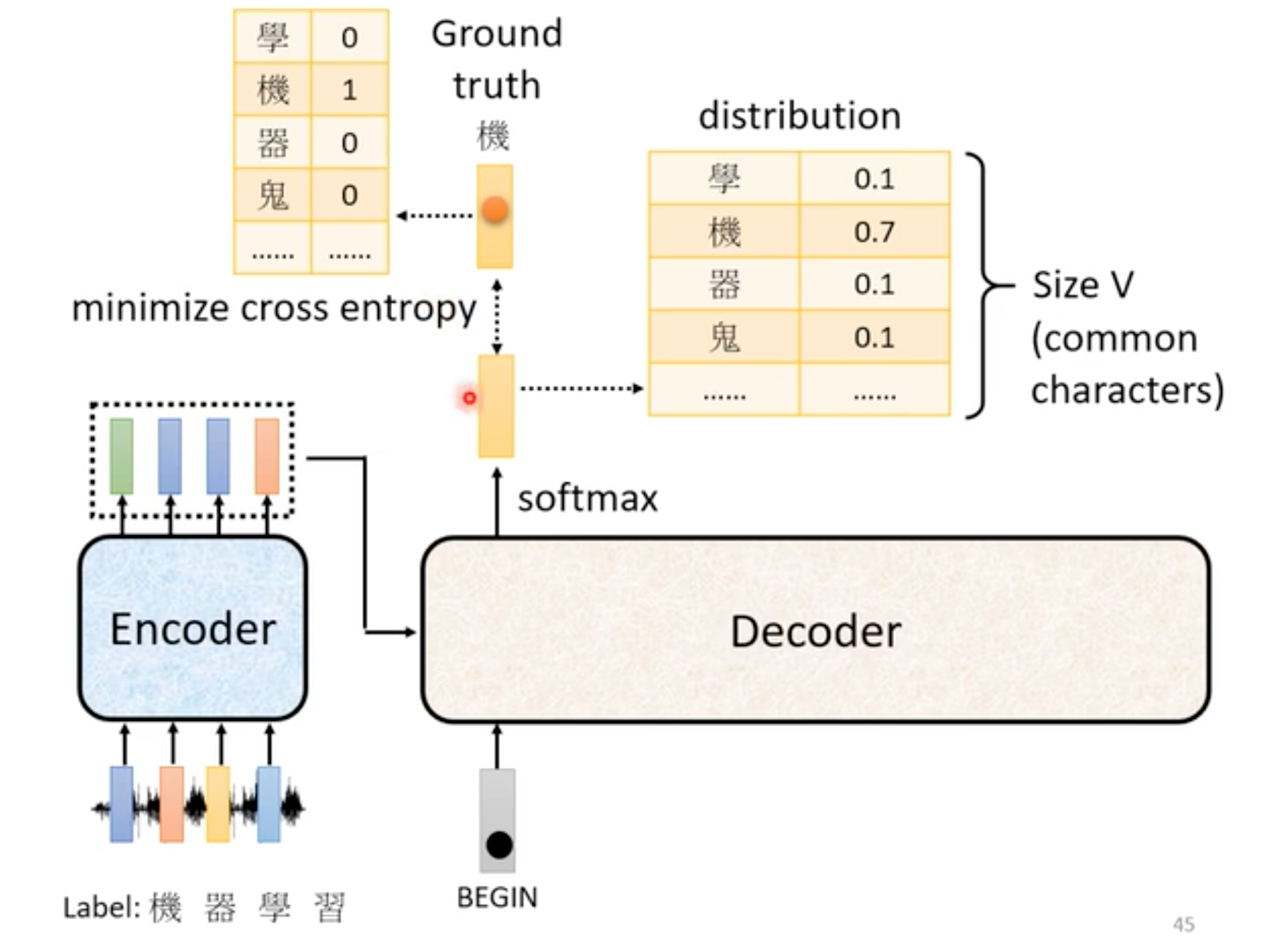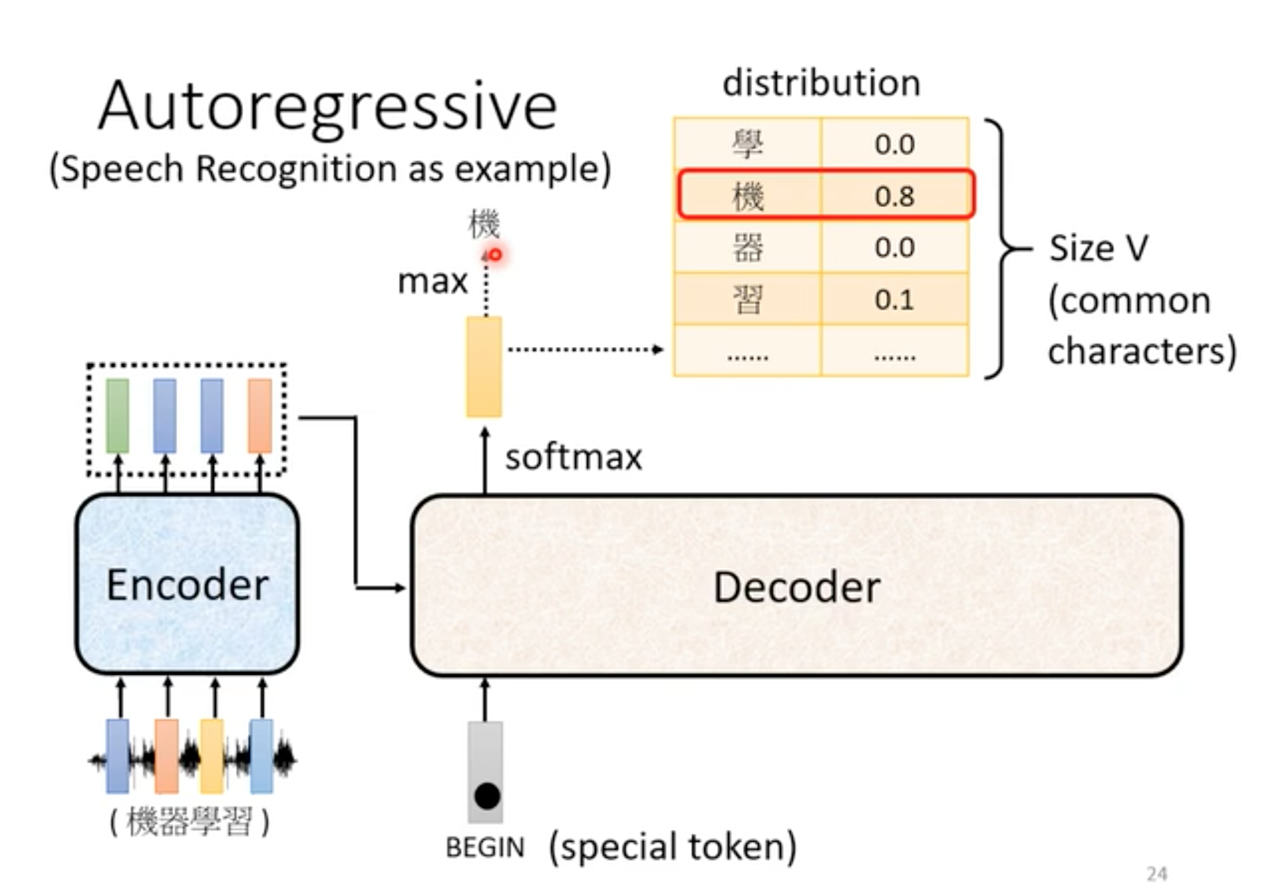 以语音识别为例:输出是所有中文词汇表+1(EOS,end of sentence,表示句子结束)大小的一个向量,输入是encoder和之前的预测结果,第一个字的话就是BOS,第二个字的输入就是encoder的结果+BOS+之前预测出来的机,预测结果经过softmax之后得到一个分布,取其中概率最大的字作为预测结果。