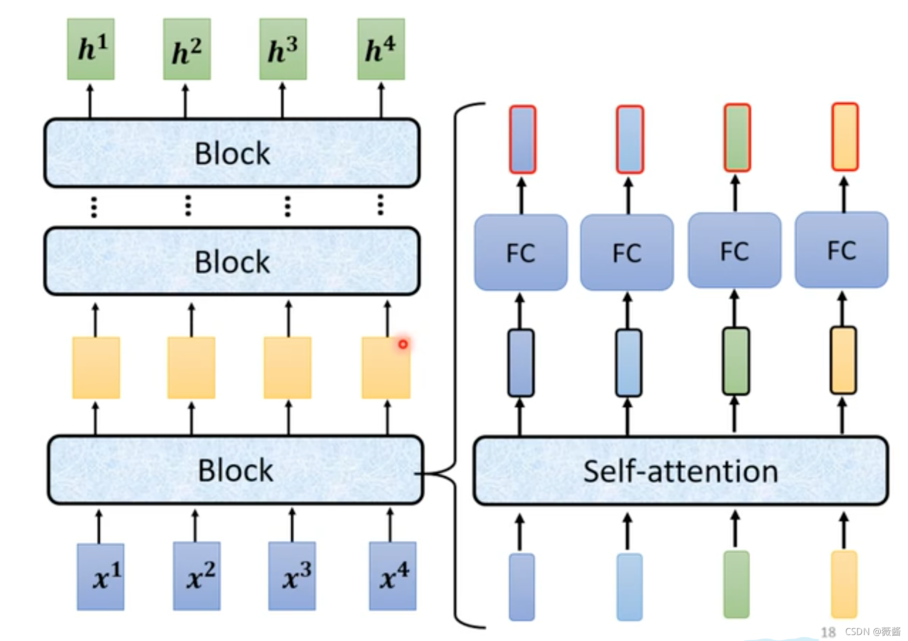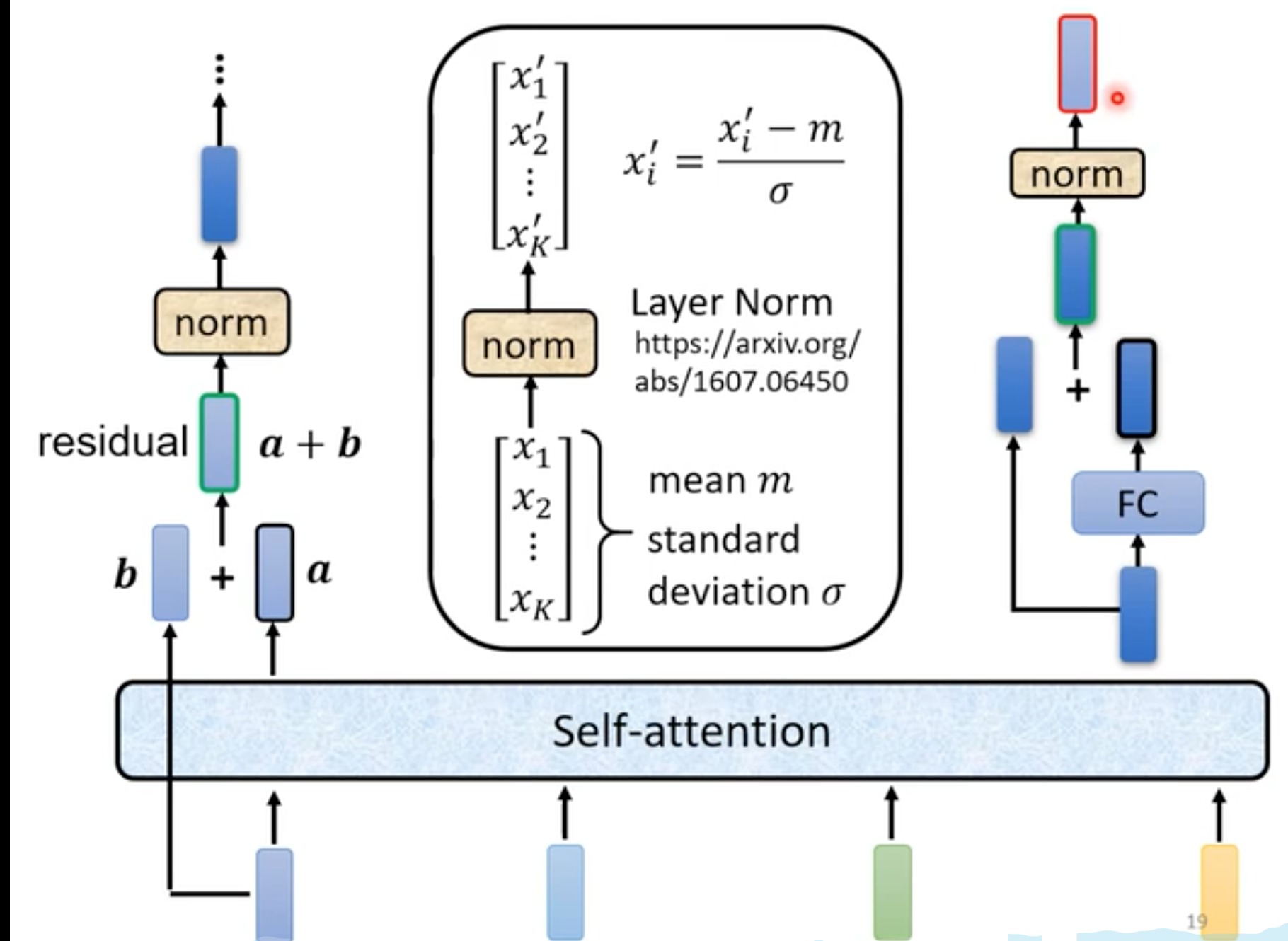 首先,输入一排vector,做self-attention之后,得到一排vector a,每一个vector都是考虑了所有输入的vector得到的结果,vector a再加上原先的vector b(这样的架构就是residual connection,残差),得到了一个新的output1。