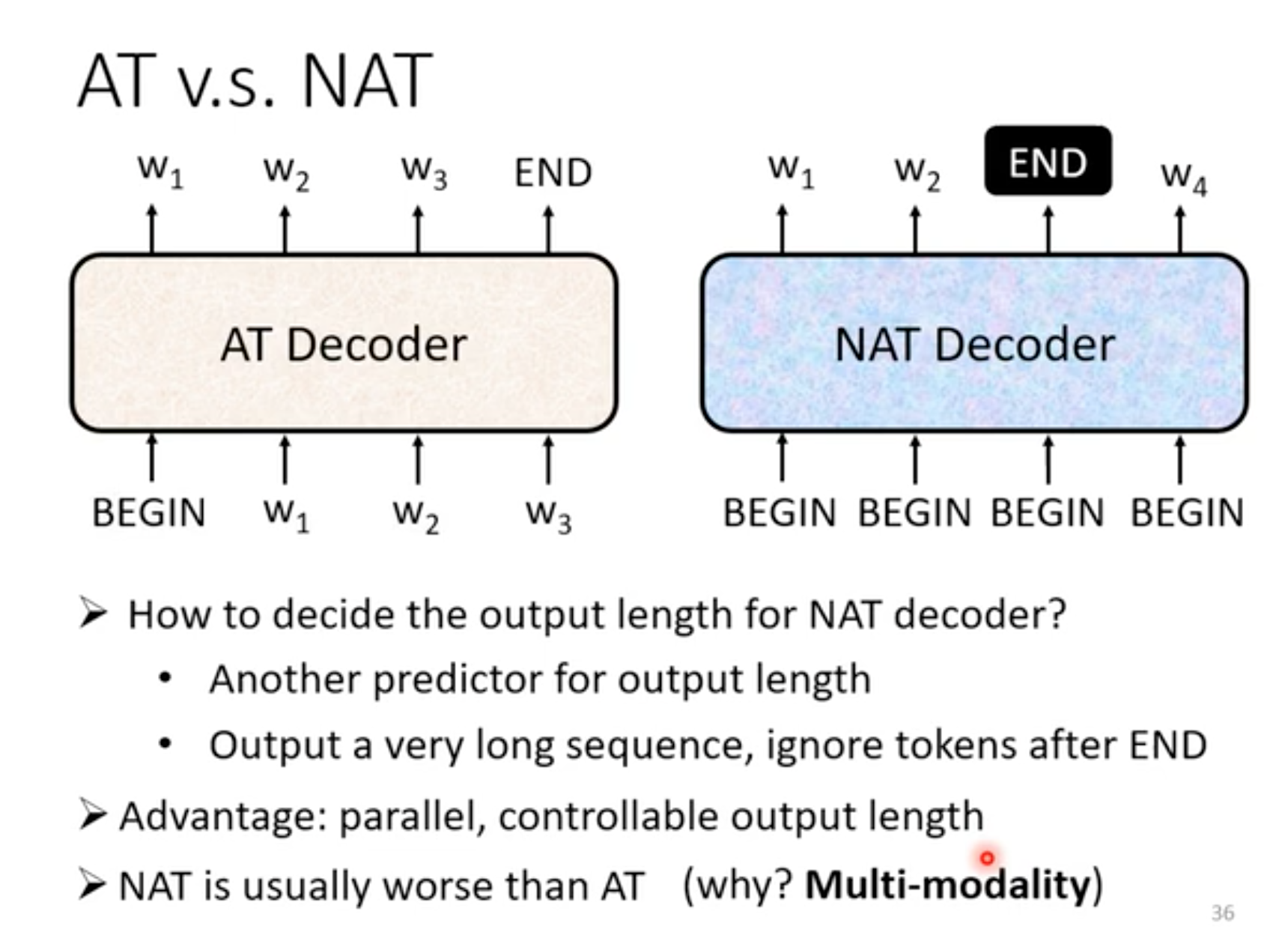 NAT:可以控制输出结果的长度,在语音合成时, 有一个分类器判断输出结果的长度,如果想要语速变快,就可以将分类器输出结果的长度除以2