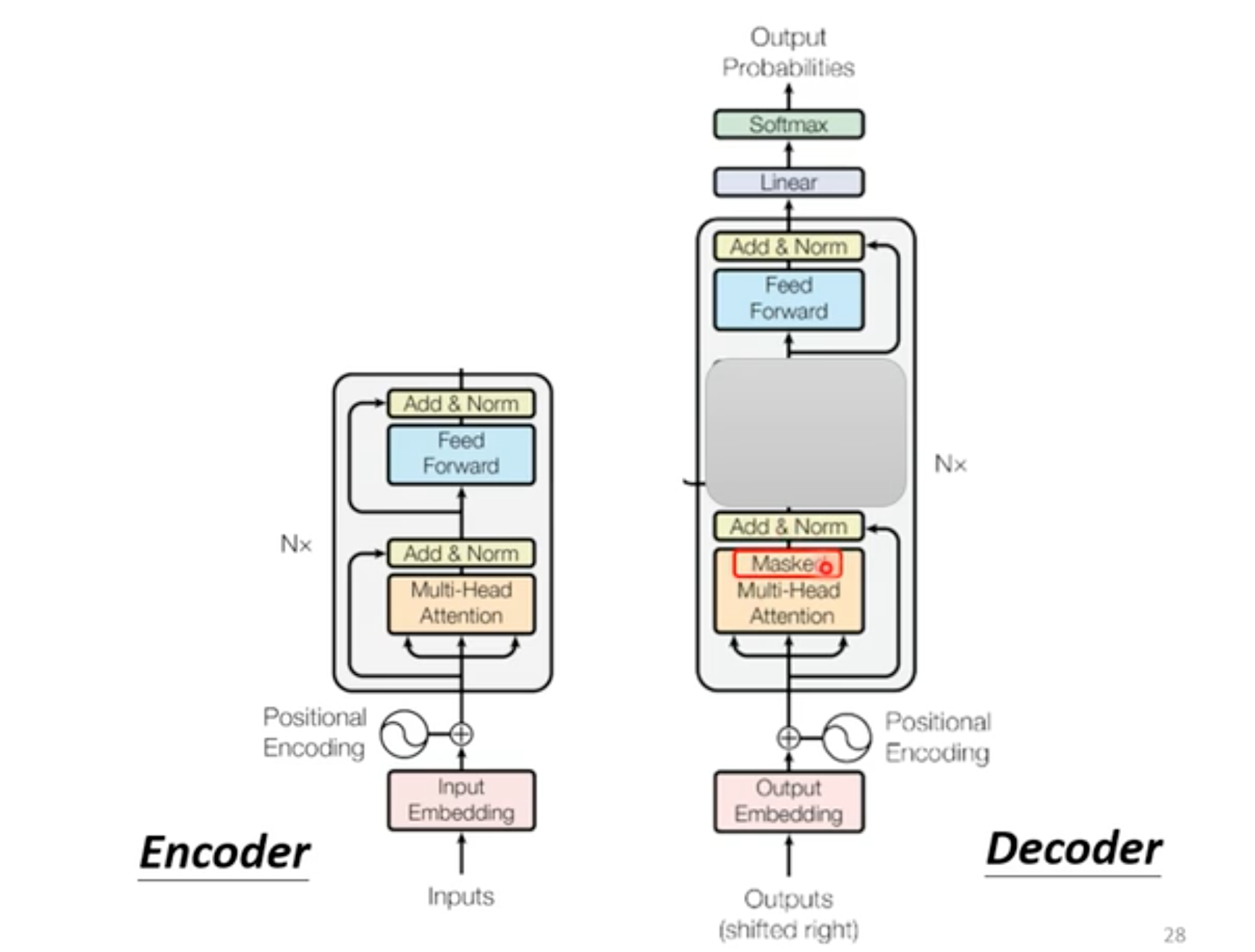 可以发现,除去中间的部分之后,encoder和decoder剩下的部分几乎是一样的,除了attention部分用的是masked multi-head attention。那masked 是指什么意思呢?