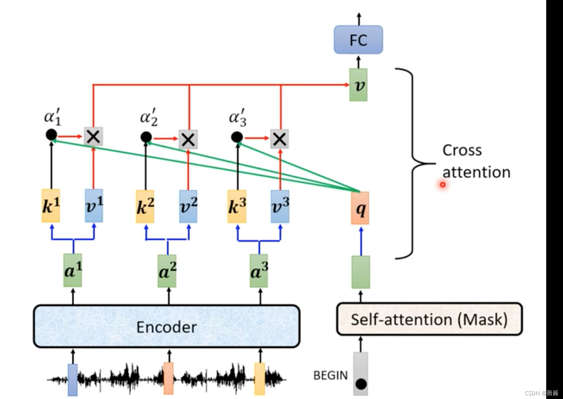 在刚刚decoder的结构中,被遮挡住的,其实就是两者如何连接的部分。其实和self-attention的结构非常相似,只不过对应的q是来自于decoder,而k,v则是来自于encoder,这种结构我们称之为cross-attention