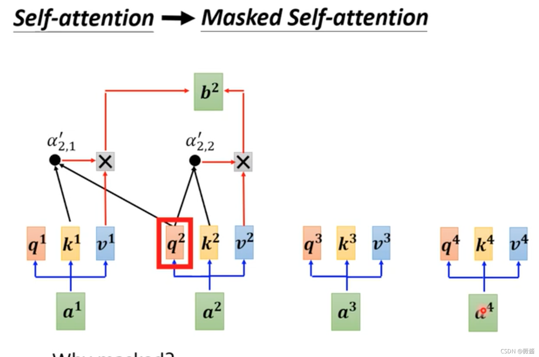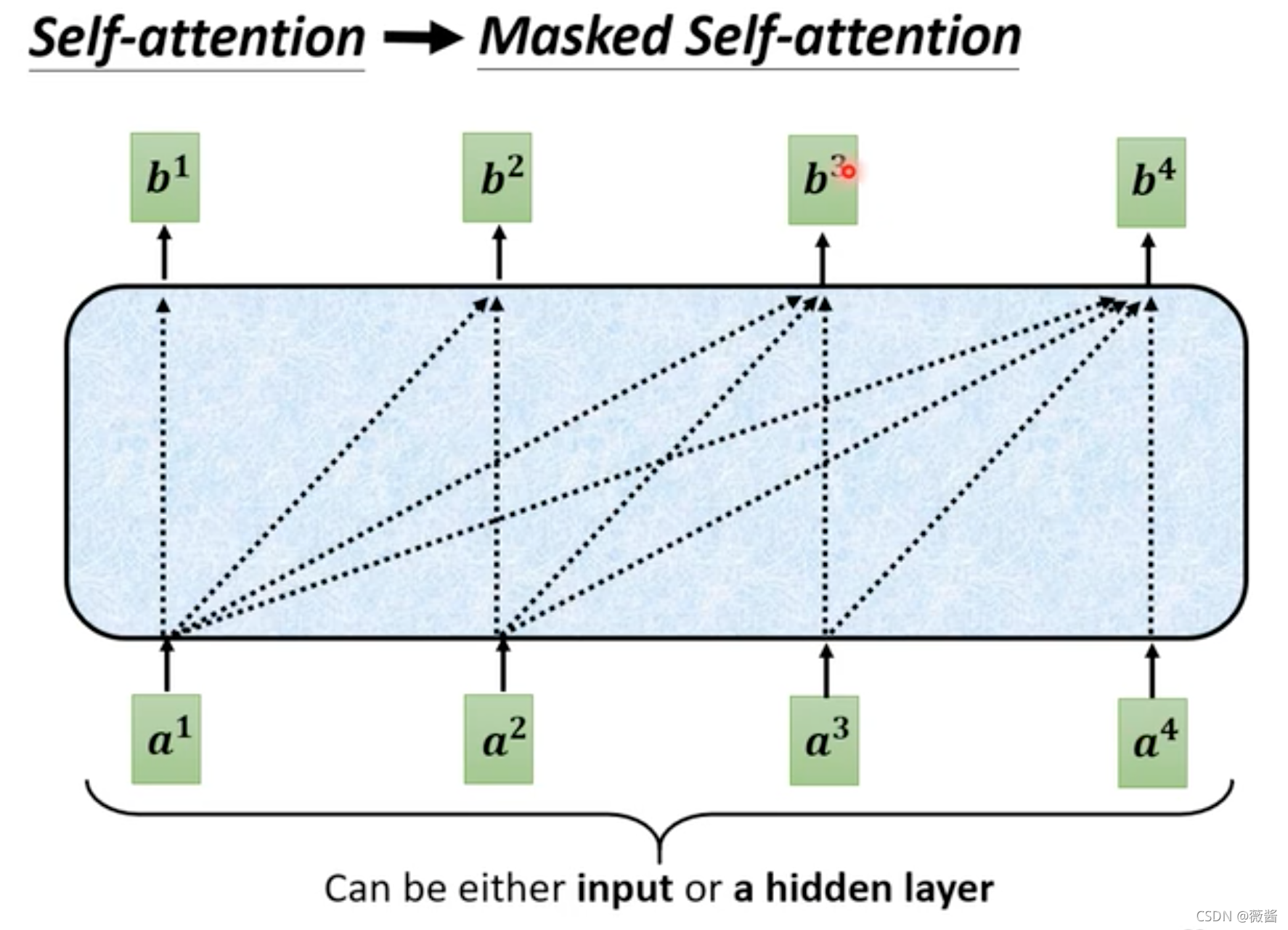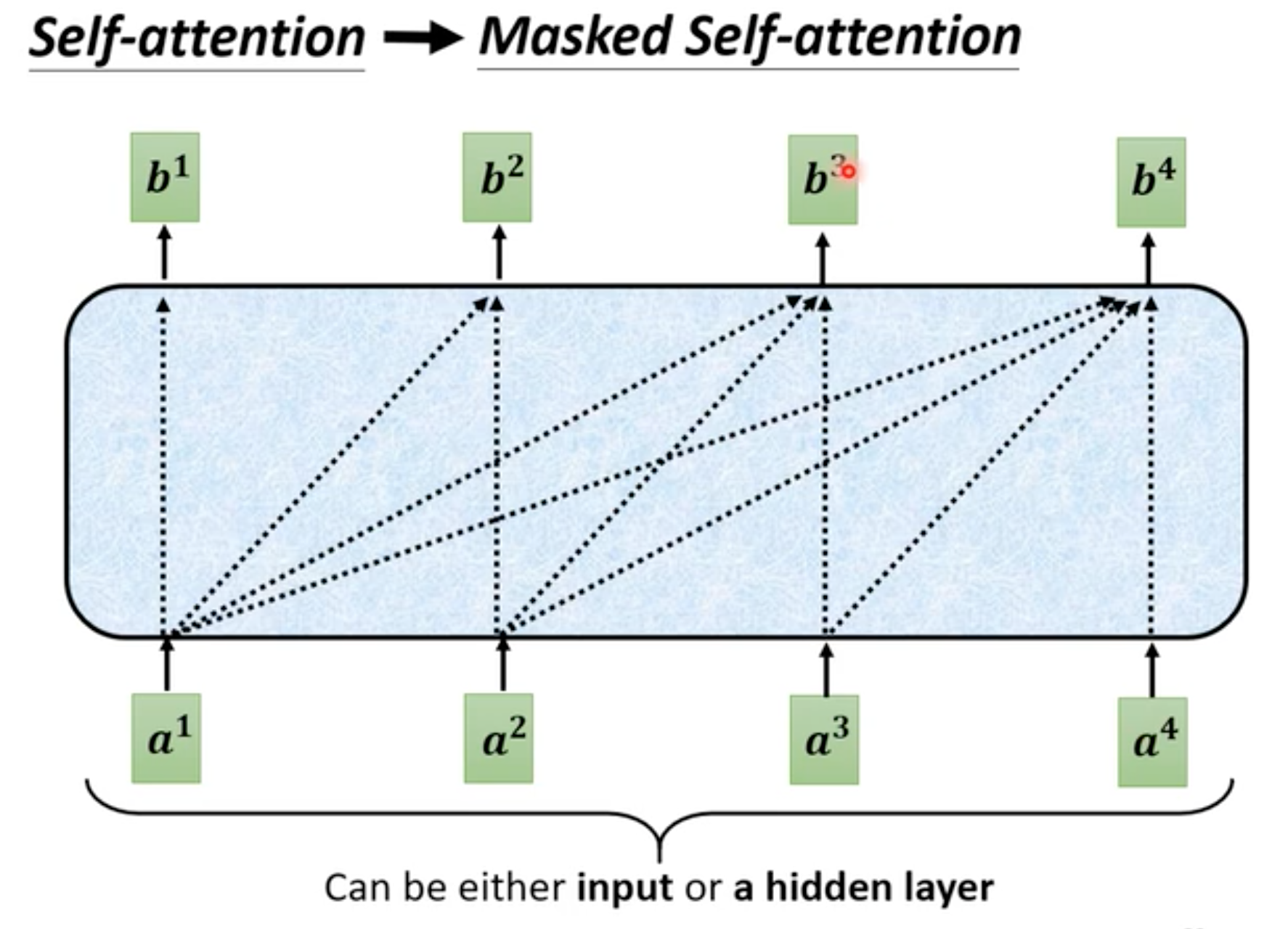 刚刚将AT的时候讲到,每一个字训练的时候,会使用到之前的数据,而self-attention 则是一开始就看到了所有的向量再做决定,决定训练出什么向量,而在mask attention则是每一个向量预测的时候,只能够看之前的向量的结果,而不能看之后向量的结果。