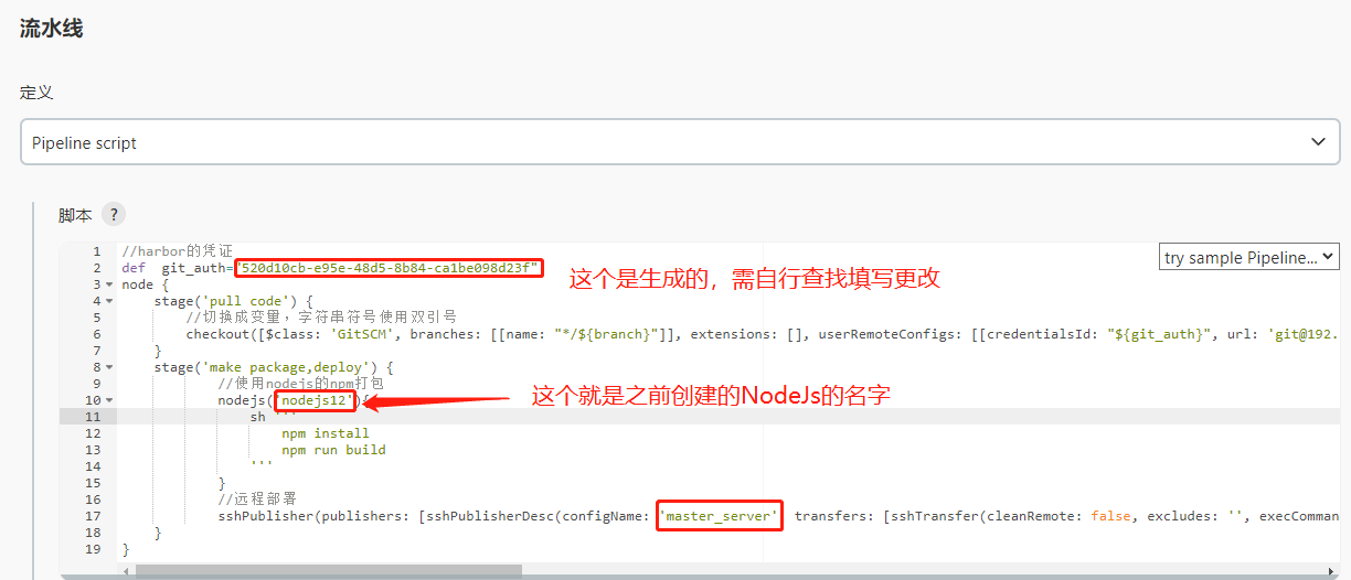checkout([$class: 'GitSCM', branches: [[name: "*/${branch}"]], extensions: [], userRemoteConfigs: [[credentialsId: "${git_auth}", url: 'git@192.168.195.180:kgc_group/tensquare_front.git']]])