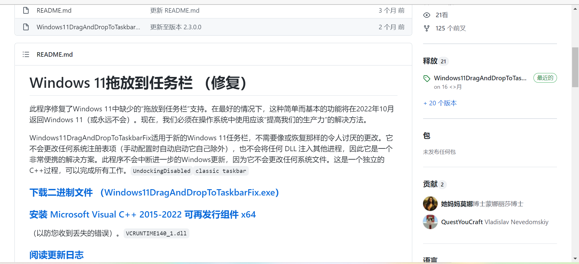 Win11拖动文件从任务栏进入软件方法下载这个:GitHub - HerMajestyDrMona/Windows11DragAndDropToTaskbarFix: "Windows 11 Drag & Drop to the Taskbar (Fix)" fixes the missing "Drag & Drop to the Taskbar" support in Windows 11. It works with the new Windows 11 taskbar and does not require nasty changes like UndockingDisabled or restoration of the classic taskbar.https://github.com/HerMajestyDrMona/Windows11DragAndDropToTaskbarFix就能实现把文件拖到应用里的效果了。 版权声明:本文为averagePerson原创文章,遵循CC 4.0 BY-SA版权协议,转载请附上原文出处链接和本声明。原文链接:https://blog.csdn.net/averagePerson/article/details/124393473