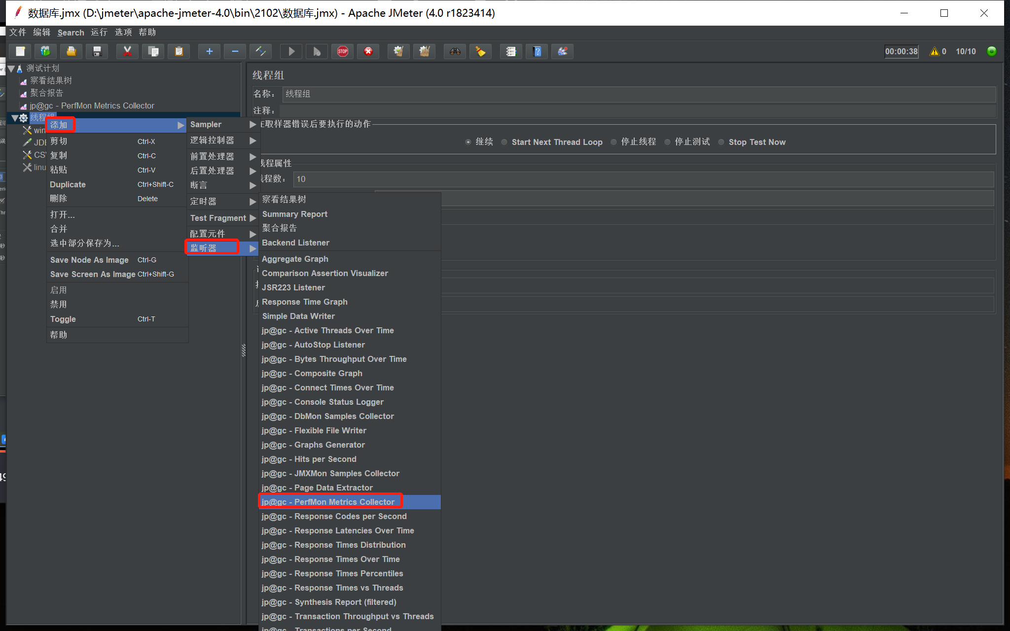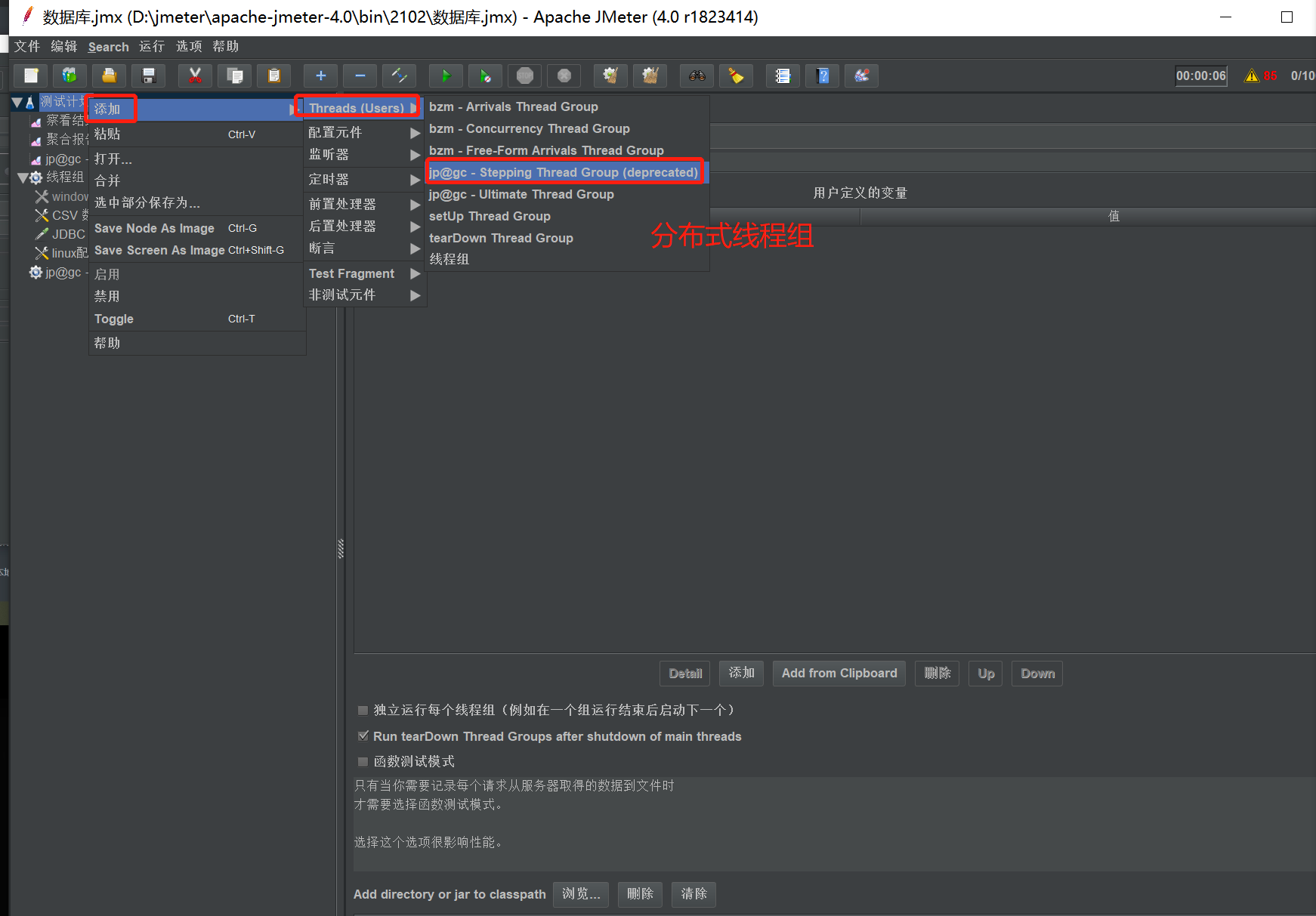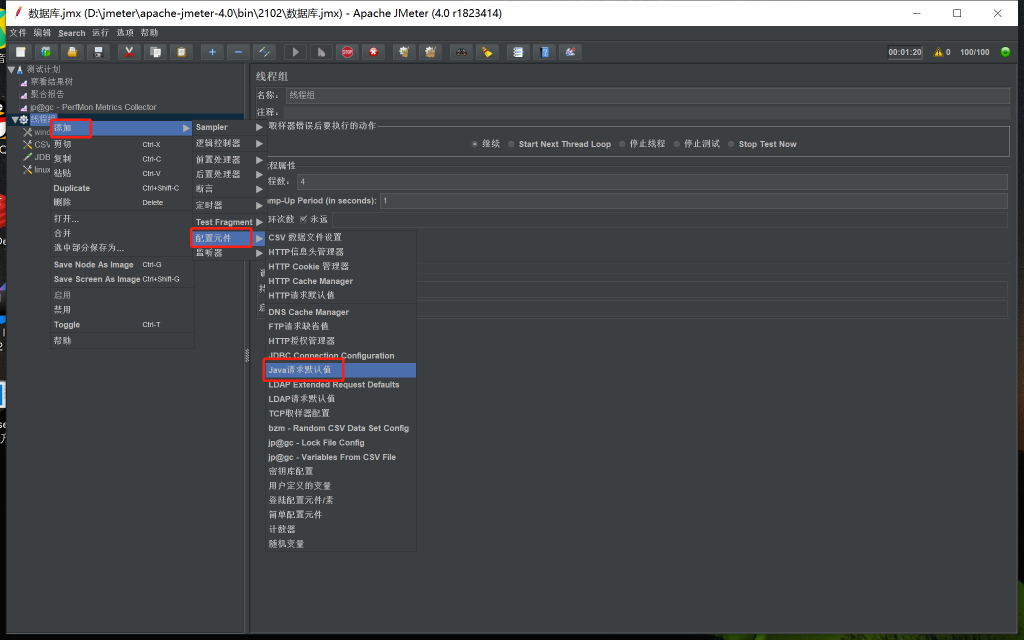 启动jmeter,打开界面工具,添加一个线程组,添加驱动