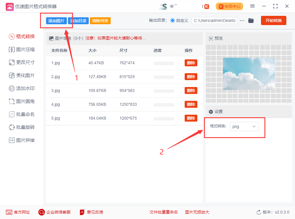 步骤二:接着点击左上角的点击【添加文件】蓝色按钮,把要转换的jpg图片添加到软件中,当有多个文件需要转换时,我们批量上传,因为软件支持一键批量转换;文件添加完后,自定义要转换的格式,在下拉框中选择“png”格式。