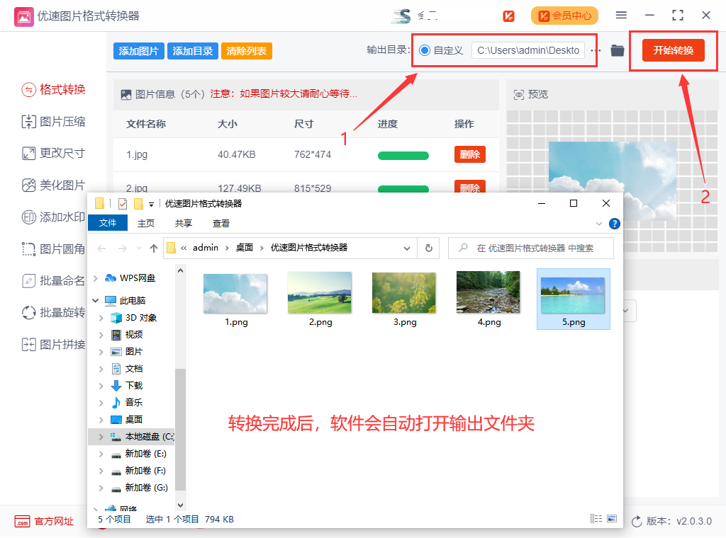 步骤三:转换前设置输出目录文件夹,一会转换成的png图片就保存在这里,待转换结束后,软件会把输出目录文件夹自动弹出打开,方便用户查看文件;最后我们就可以点击【开始转换】红色按钮开始转换了,稍等片刻,转换就成功了。
