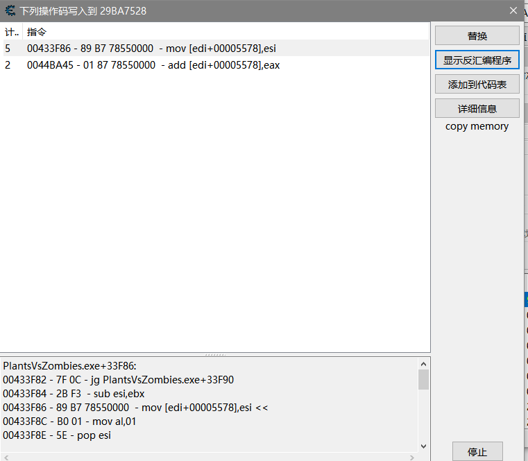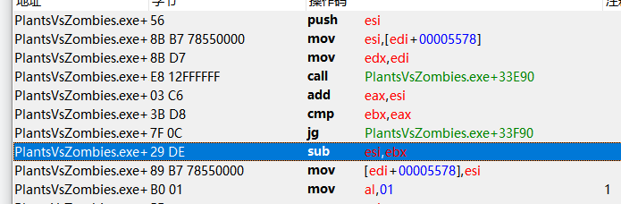 所以猜测esi为阳光值,ebx为种植物消耗的阳光值,所以只要将sub改为add就能实现阳光越用越多