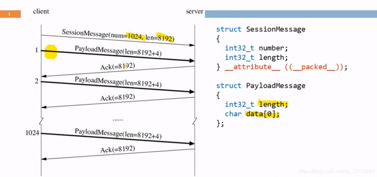以上发送的message都是在应用层中体现的。当一个client发起ttcp的请求时,首先会向server发送一个SessionMessage,里边主要包含了即将发送的数据包个数和每个包的长度。PayloadMessage便是实际的数据,里边包含了一个表示长度的length,和实际的数据data,其中data使用了柔性数组。