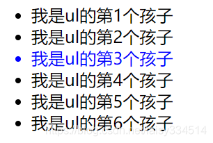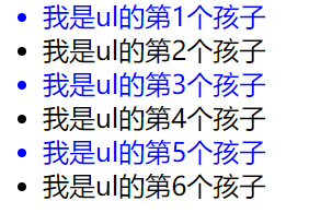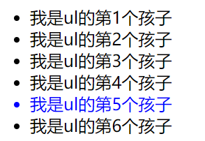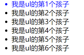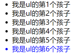li:last-child { color: blue; }<ul> <li>我是ul的第1个孩子</li> <li>我是ul的第2个孩子</li> <li>我是ul的第3个孩子</li> <li>我是ul的第4个孩子</li> <li>我是ul的第5个孩子</li> <li>我是ul的第6个孩子</li> </ul>