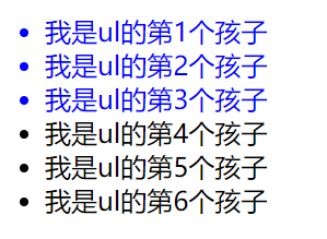 li:nth-child(-n+3) { /*表示选中前三个*/ color: blue; }body部分的代码同前两种一样