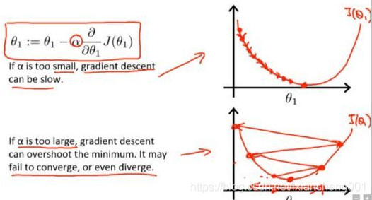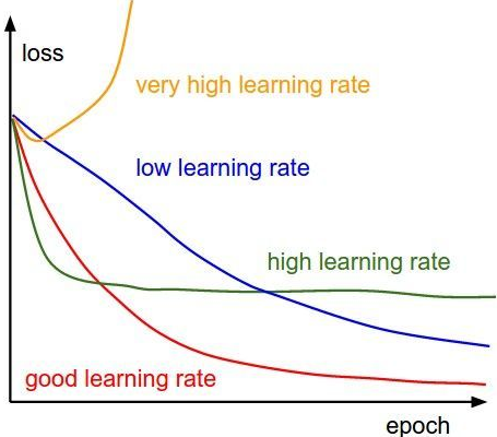 如果学习率过小,梯度下降很慢,如果学习率过大,如Andrew Ng的Stanford公开课程所说梯度下降的步子过大可能会跨过最优值。不同的学习率对loss的影响如下图所示: