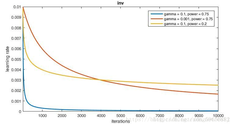 inv,这种学习策略的优势就在于它使得学习率在每一次迭代时都减小,但每次减小又都是一个非常小的数,这样就省去的自己手动调节的麻烦。这种策略使用的也很普遍。