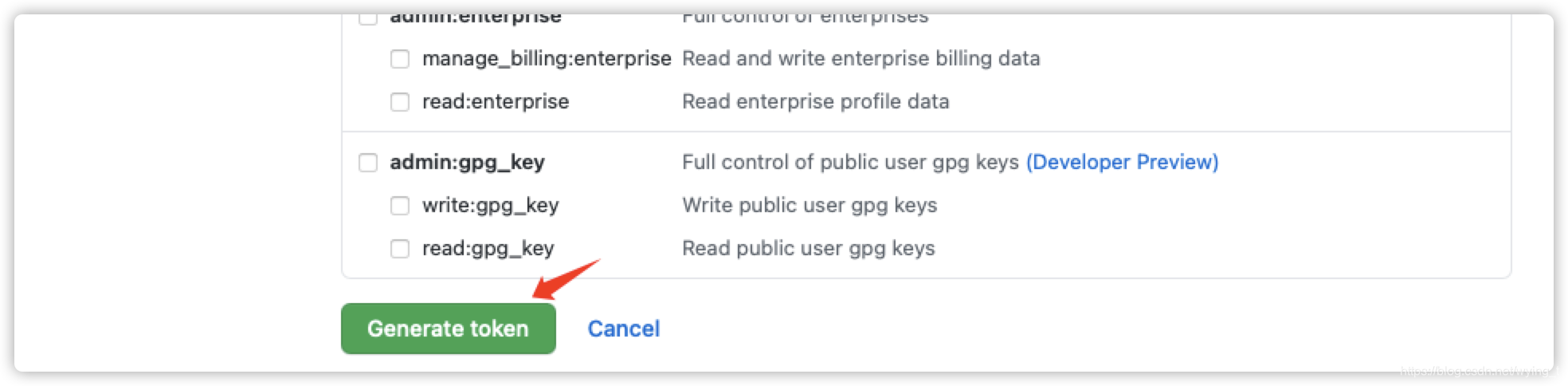 步骤四:在页面中勾选全部所有权限,然后在最底下点击Generate token