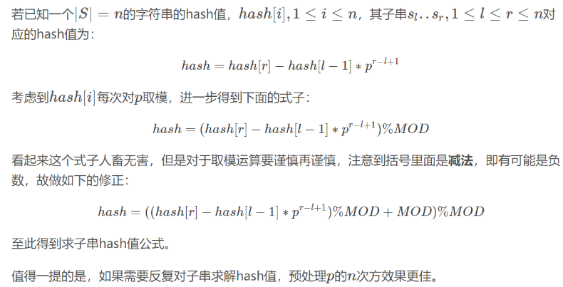 }如果需要算出一个字符串长度为n的所有子串,则提前预处理出0~i的哈希值hash[i],则可以以0(1)的复杂度算出[l,r]的哈希值