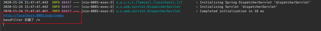 这样我们一个完整的过滤器就配置好了。当你再访问/pub接口时,是不会被BaseFilter拦截到的。