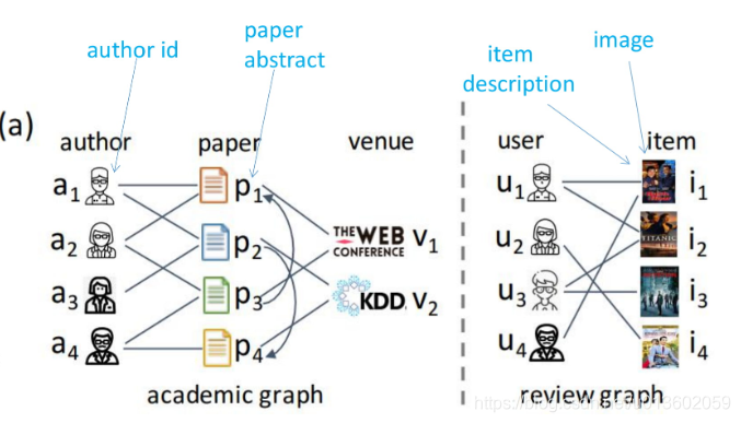 - 每个节点都带有非结构化的属性特征,如text、image,常用的从concatenate或者linear transformation不能建模节点属性间的deep interaction。那么问题2就是:如何设计异质图上节点属性的encoder来处理不同节点内容异质性问题。