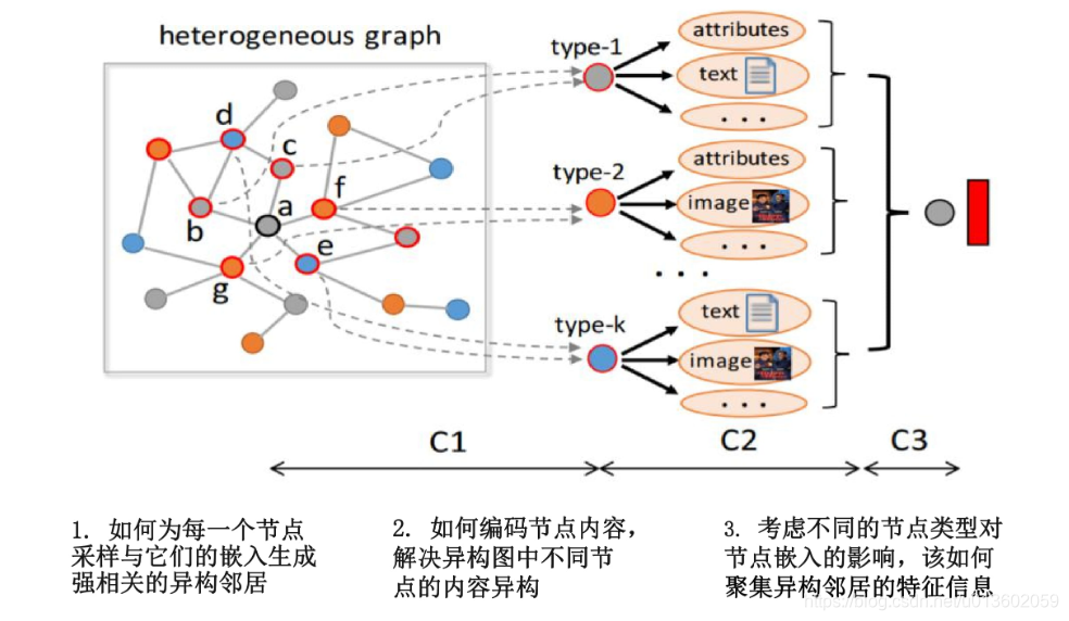 言归正传,作者认为目前异质图处理的难点在于,一方面要处理图的结构信息,如不同类型的点和边,另一方面要关注每个节点所具有的属性(例如文本或图像),尽管在同构或异构图嵌入、属性图嵌入以及图神经网络等方面已经有了大量的研究,但很少有研究能同时考虑异构的节点、边和异构的内容。因此,作者提出了HetGNN模型来解决此事。