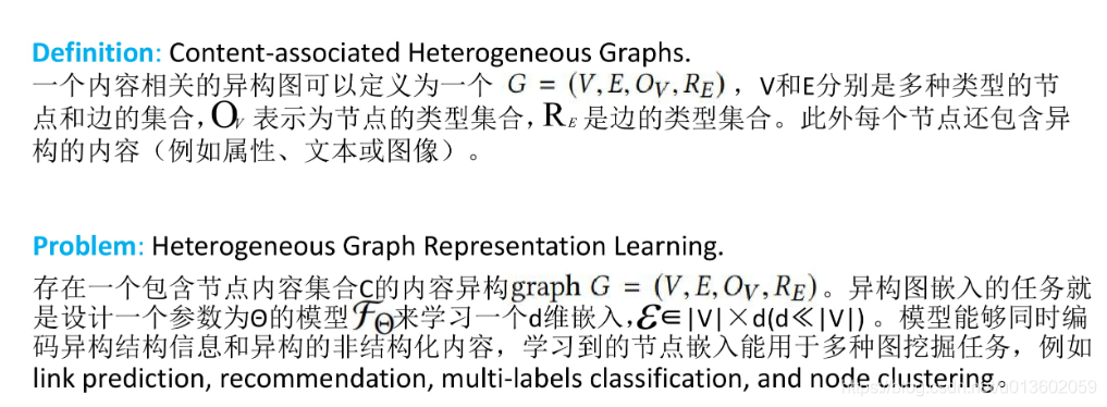 - 本文正式定义了同时考虑图的结构异构和节点内容异构的异构图表示学习问题。