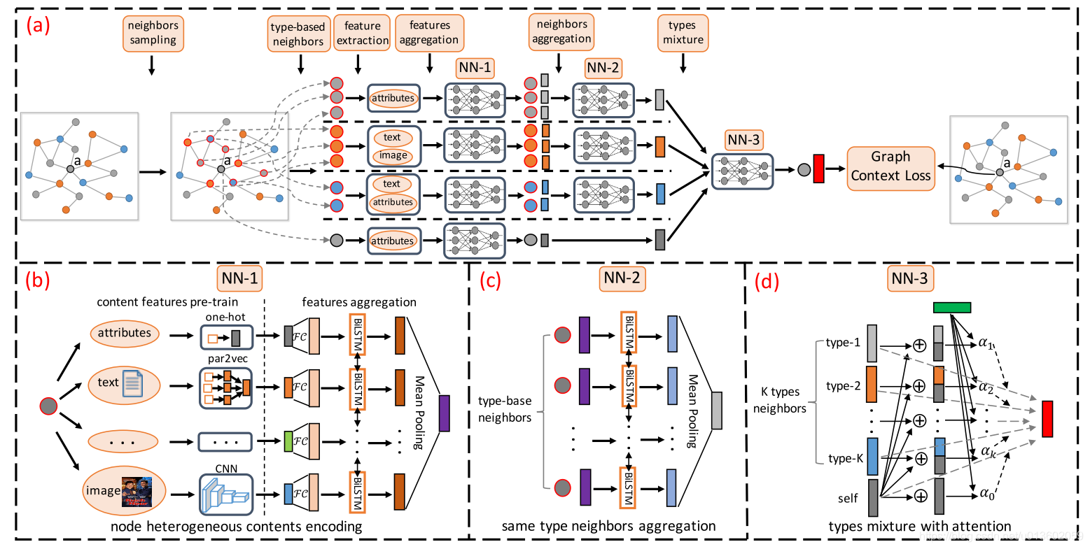 - 相同类型的邻居(有相同的内容特征)被分组,那样就可以用type-based aggregation。我觉得意思是指同类型的节点影响肯定最大,但其他类型也会有影响。