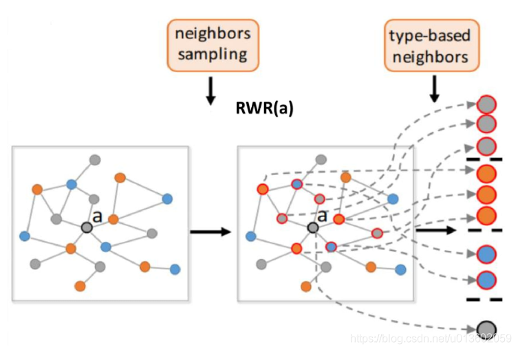 - 设计了一个基于重启策略的随机游走方法,来为图中的每一个节点采样固定数量的 强相关的异构邻居,随后依照节点的类型对采样的邻居节点进行分组。