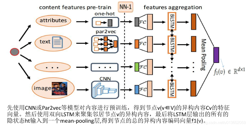 第一步,一个节点具有的不同属性集合 Cv ,那就对每个属性分别进行encoding。如对于text就用预训练的word embedding进行encode,对于image可以用CNN进行encode,总之最后得到每个attribute的embedding表示 xi。