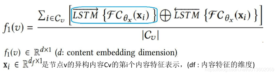 采用BiLSTM来处理无序的内容集合Cv,能捕捉“深度”特征交互并积累表达能力。对于不同类型的邻居节点也使用不同的BiLSTM来聚集它们的异构内容特征。