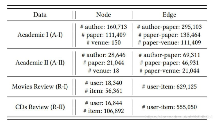 本文的实验用到了4个数据集,其中包括2个学术图和2个评论图。具体信息如下: