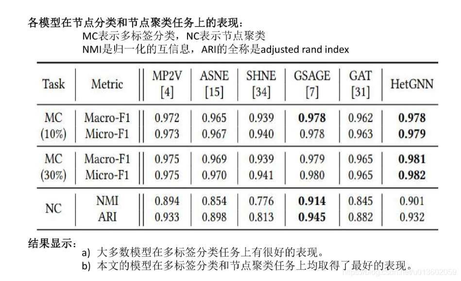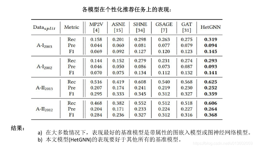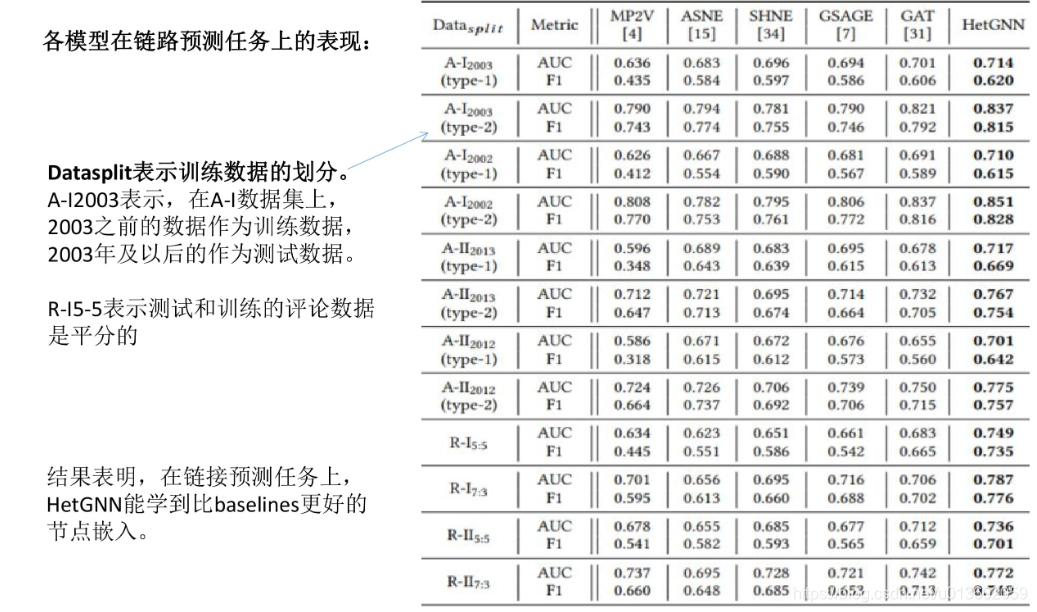- 本文在多个公开数据集上做了大量的实验,证明了HetGNN在许多的图数据挖掘任务上的性能明显优于基准模型。