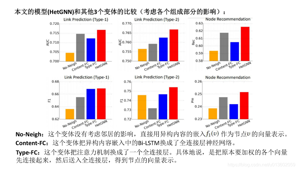 - 本文模型的不同的组成部分,例如节点异构内容编码或异构邻居聚集对模型的性能有什么影响?