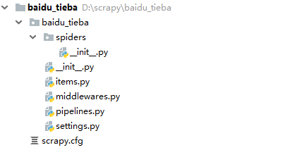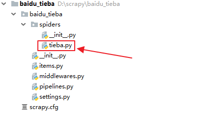 d:\scrapy\baidu_tieba>scrapy genspider tieba tieba.baidu.com执行完该命令后,将会在项目的 spiders 目录下生成一个 tieba.py 文件 :