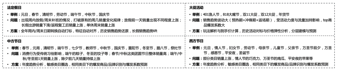 此外,两者在结果上的不同点是:特殊节日的商品销量呈现单点脉冲式变化,而季节性商品的销量变化趋势具有连续性,幅度相对平缓。下面列举了常见的特殊日期: