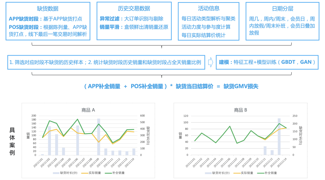 盒马缺失值补全的整体思路如下:方法上使用了GBDT和GAN两类模型,并根据当日的缺货时段数据、促销和价格信息,以及历史相同时段的销量等信息分别对APP和POS渠道的缺货时段销量进行补全(下图给出了两个商品补全的例子)。此外,基于补全销量和当日价格信息可进一步预估缺货造成的GMV损失,该数据可提供给业务进行缺货影响分析: