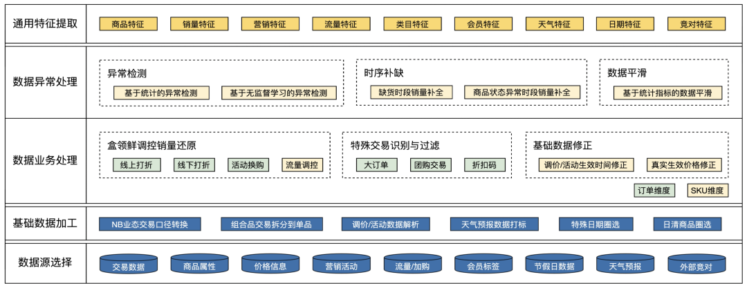 基础数据加工:对DW层的原始数据做进一步加工,生成适用于算法的数据,例如组合商品交易拆分到单品,未来调价/促销活动解析,天气类型打标,日清商品圈选等。