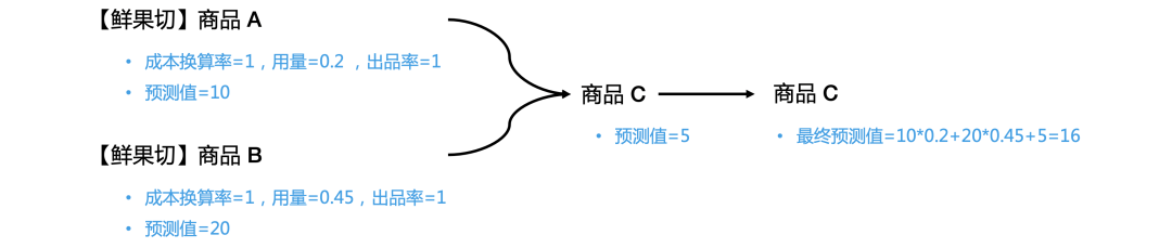 该环节主要是根据业务规则对销量预测结果进行处理,包括按照BOM关系中的用量、出品率、成本换算率计算原料品的预测结果,并在补货推单的时候扣减成品和原料库存。比如下面这个例子中,原料“商品C”有两个产成品“【鲜果切】商品A”和“【鲜果切】商品B”,并且原料品和产成品均可售,因此在对“商品C”进行补货的时候,需同时考虑产成品和其本身的需求量: