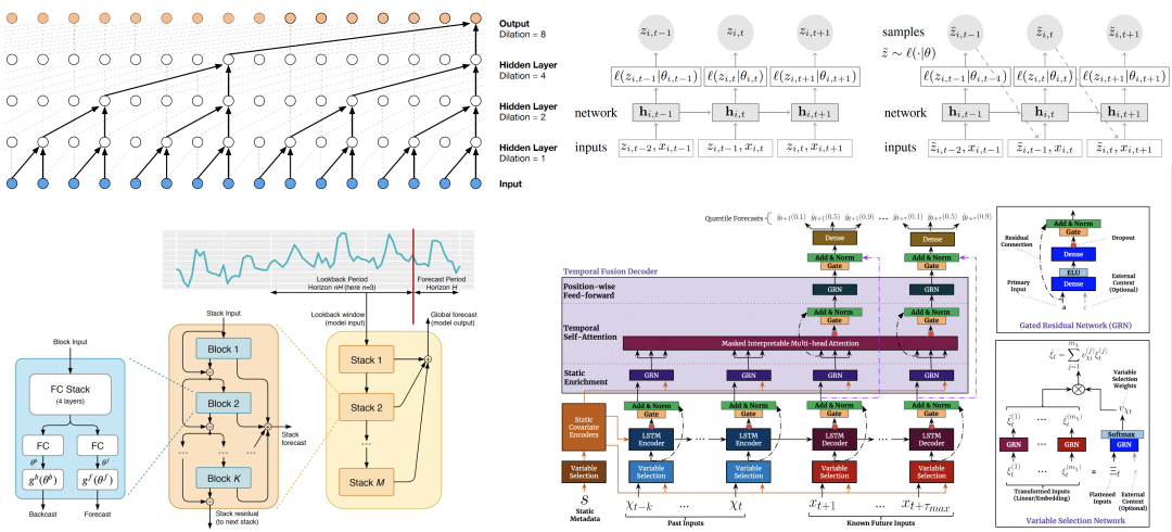 WaveNet是Google DeepMind在2016年提出的基于CNN结构的模型,一般CNN应用于长序列的局限性在于卷积提取的是局部信息,想要扩大感受野需要增大卷积核或增加模型层数。而WaveNet引入了空洞因果卷积(dilated causal convolution),一方面可以确保每个时刻不会接触到未来的信息,另一方面通过跳过一定长度的输入,可以在不增大模型层数的情况下获得更大感受野。DeepAR是Amazon在2017年提出的基于自回归循环神经网络的概率预测模型,其学习的是概率分布的参数,输出为每个时刻目标值的概率分布。DeepAR的一个亮点是可以在几乎没有历史数据的情况下执行冷启动预测,但受限于RNN结构,对于较长时间的周期季节等信息则难以补获。N-BEATS是Bengio团队于2020年发表的基于时序分解思想的深度网络模型,其基本计算单元是Block,多个Block通过堆叠形成一个Stack,整个模型就是由多个Stack进一步堆叠而成。每个Block会输出前向和后向残差,后向残差作为下一个Block的输入进行拟合,前向残差之和作为对应Stack的预测值,将所有stack的预测值求和便得到最终的预测结果。TFT是Google提出的多变量时间序列预测模型,其在输入数据的处理和网络结构的设计上考虑较为全面。在数据处理方面,TFT采用Variable Selection Network计算每个特征的重要性,通过加权融合减少无关变量带来的影响;另外对类别特征进行单独建模,能更加有效利用ID类信息。在网络结构方面,TFT同时考虑长短周期的时序信息(LSTM提取局部时序信息,Self-attention提取长期时序信息);并通过门控单元机制过滤掉不必要的模块信息,对于不同数据集实现网络结构的自适应。